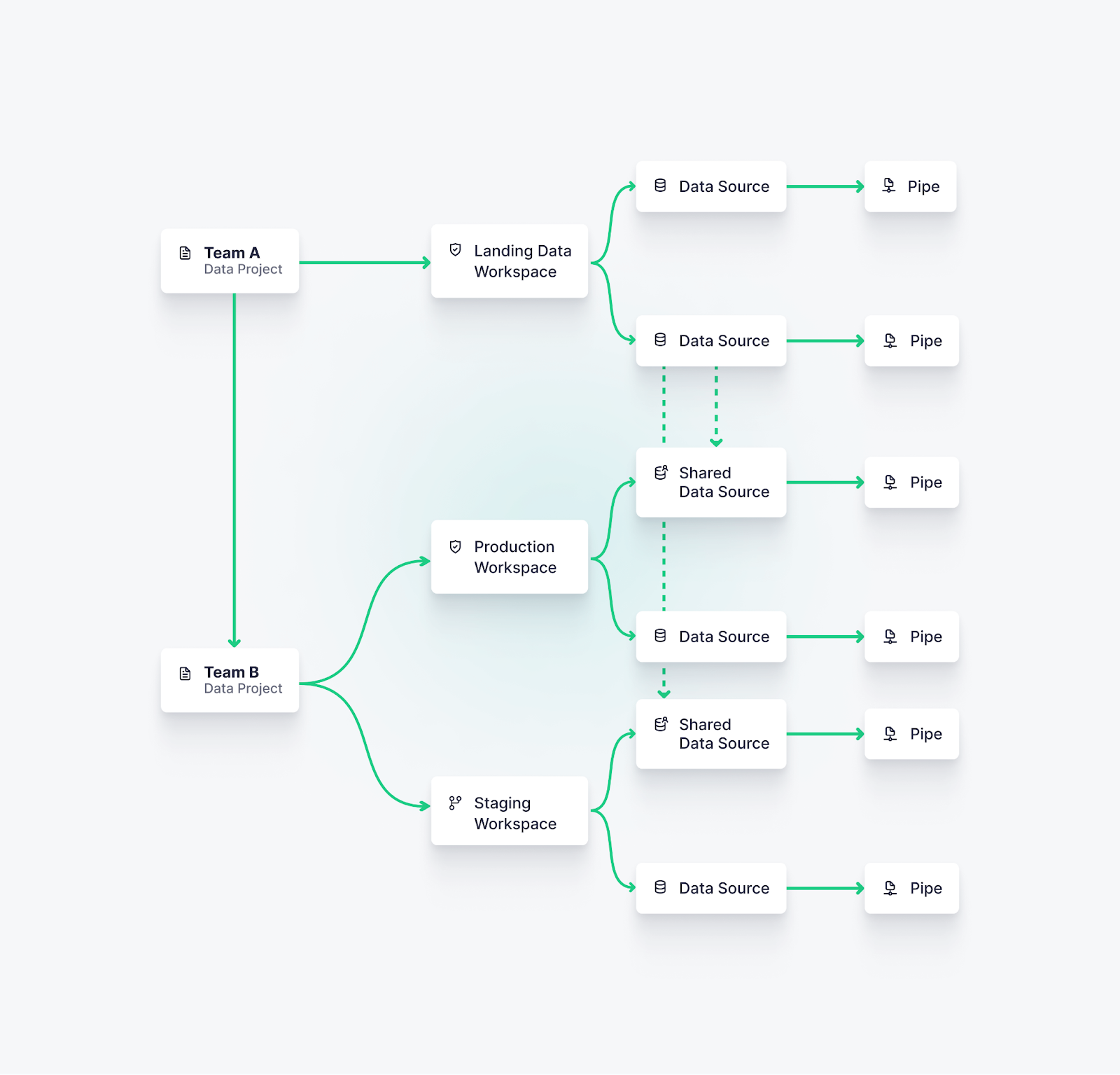 Larger teams may choose to have a “landing Workspace” controlled by data or data platform teams, with Shared Data Sources to other Workspaces for building use cases. In this case, it is wise to create unique Data Projects for each team.