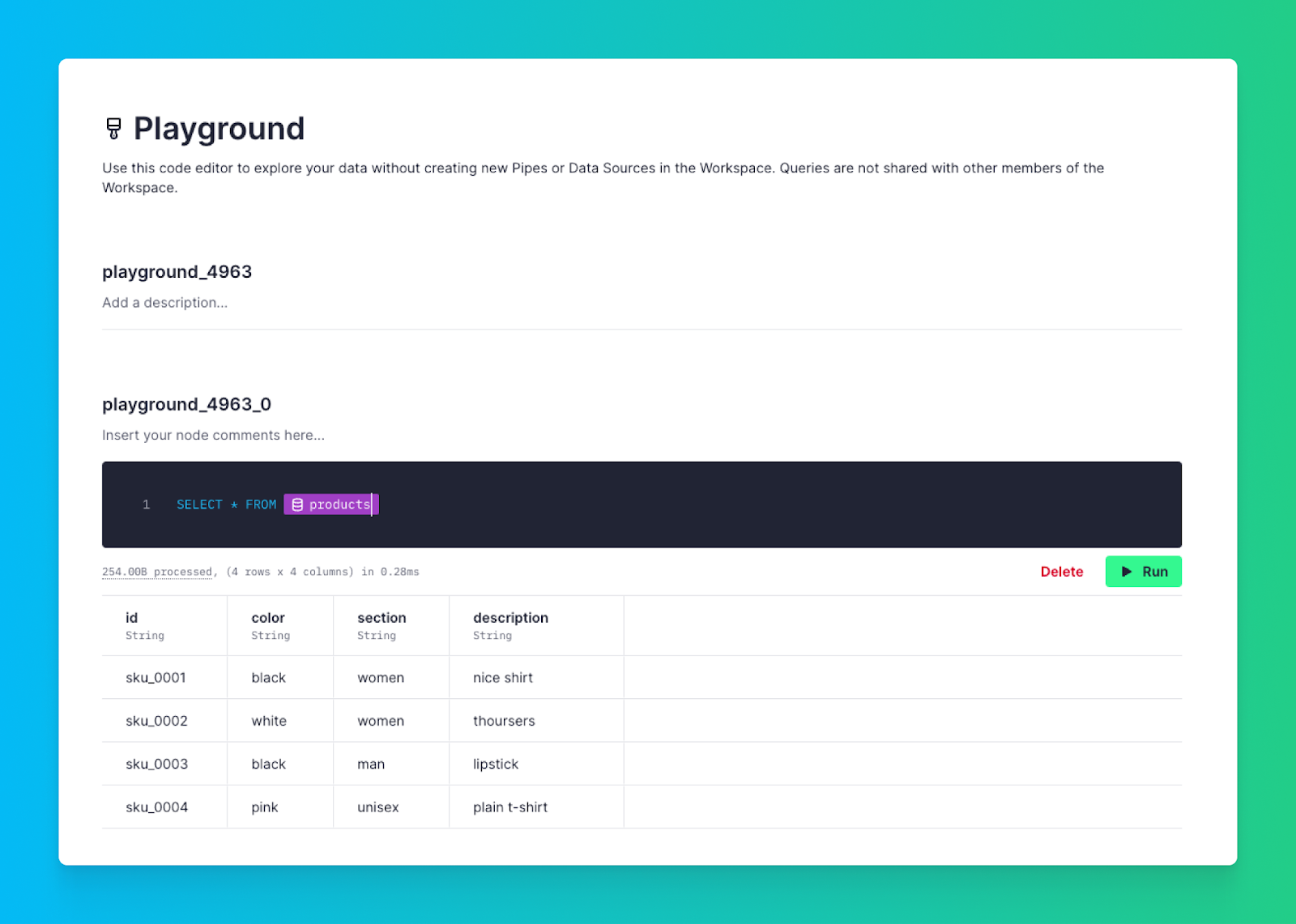 6. Playgrounds! If you want to try a new idea or test some SQL, you can use Playgrounds to build draft Pipes in the UI without worrying about breaking anything or spinning up a new Branch. Playgrounds you create are only visible to you; they aren’t automatically shared with other members of your Workspace, though you can share them on an as-needed basis.