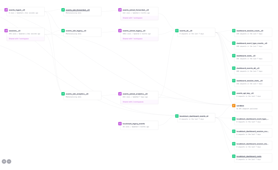 After the initial migration, Thomas and the team still had to reconcile data coming from older instances of LocalStack which were still sending events in a format that was tailored to their old MySQL database. Using Tinybird, they built a managed connector that separated sessions and events, so that they could combine cold data and hot data, all in real-time. Tinybird's "ingest > transform > expose" data flow made it a breeze to develop these migrations, which worked both for batch and realtime data. Now, all events are formatted uniformly in a single view, so the team can see how instances across all their products perform.