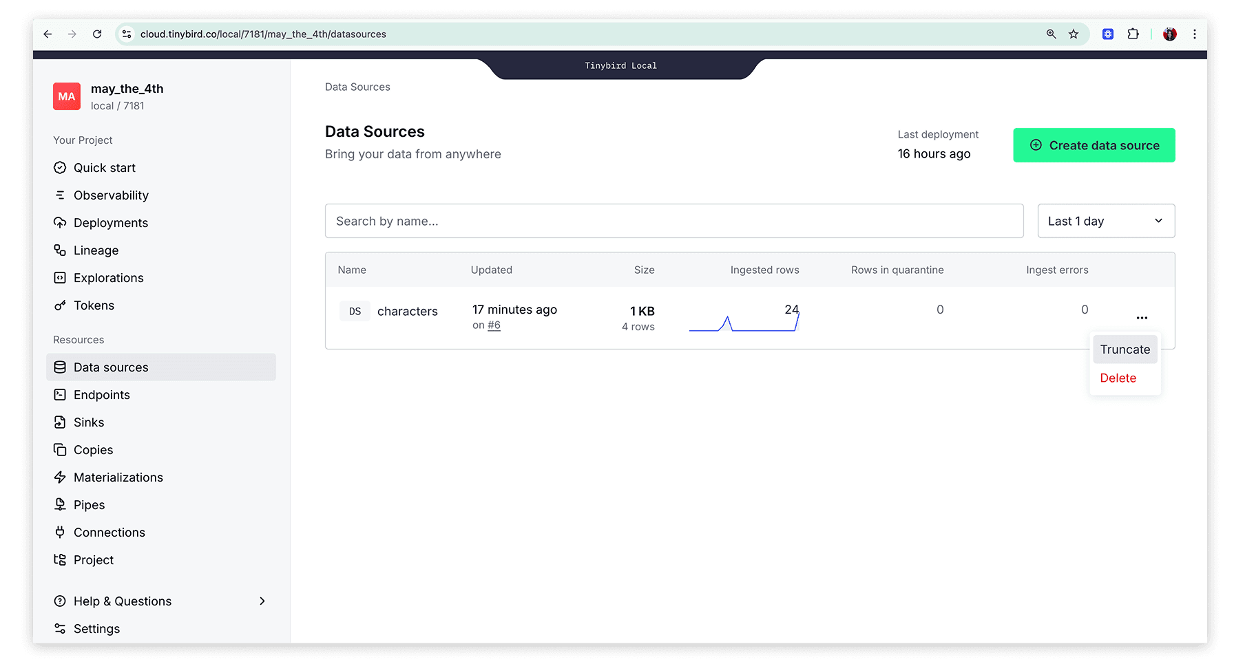 Sometimes you want to delete all data contained in a Data Source. You can perform this action from the UI and API.