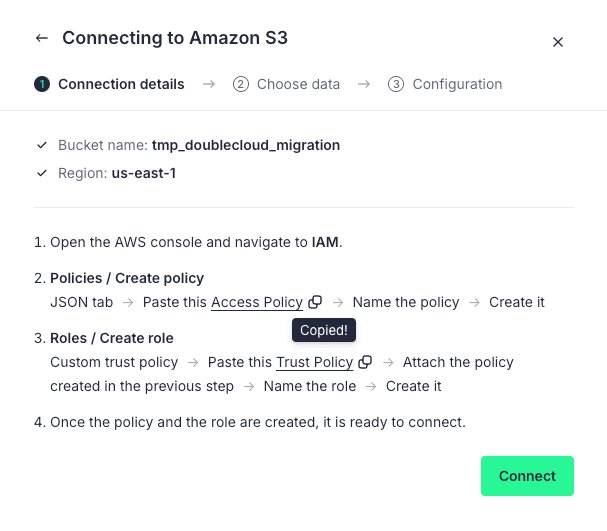 - Define an S3 Connection with IAM Policy and Role that allow Tinybird to read from S3. Tinybird will automatically generated the JSON for these policies.