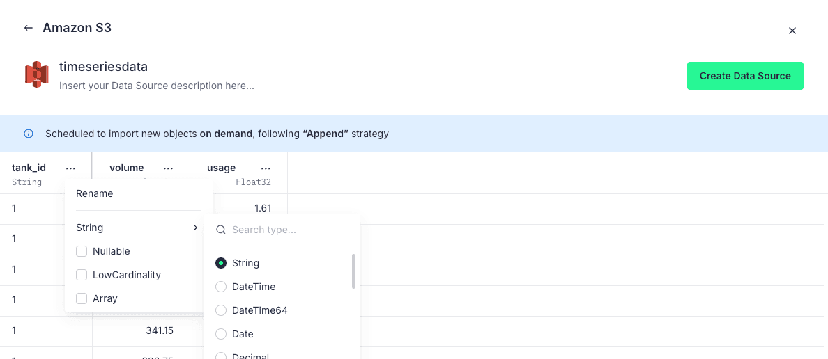 SCHEMA > `tank_id` String, `volume` Float32, `usage` Float32 ENGINE "MergeTree" ENGINE_SORTING_KEY "tank_id" IMPORT_SERVICE 's3_iamrole' IMPORT_CONNECTION_NAME 'DoubleCloudS3' IMPORT_BUCKET_URI 's3://tmp-doublecloud-migration/timeseriesdata.csv' IMPORT_STRATEGY 'append' IMPORT_SCHEDULE '@on-demand'