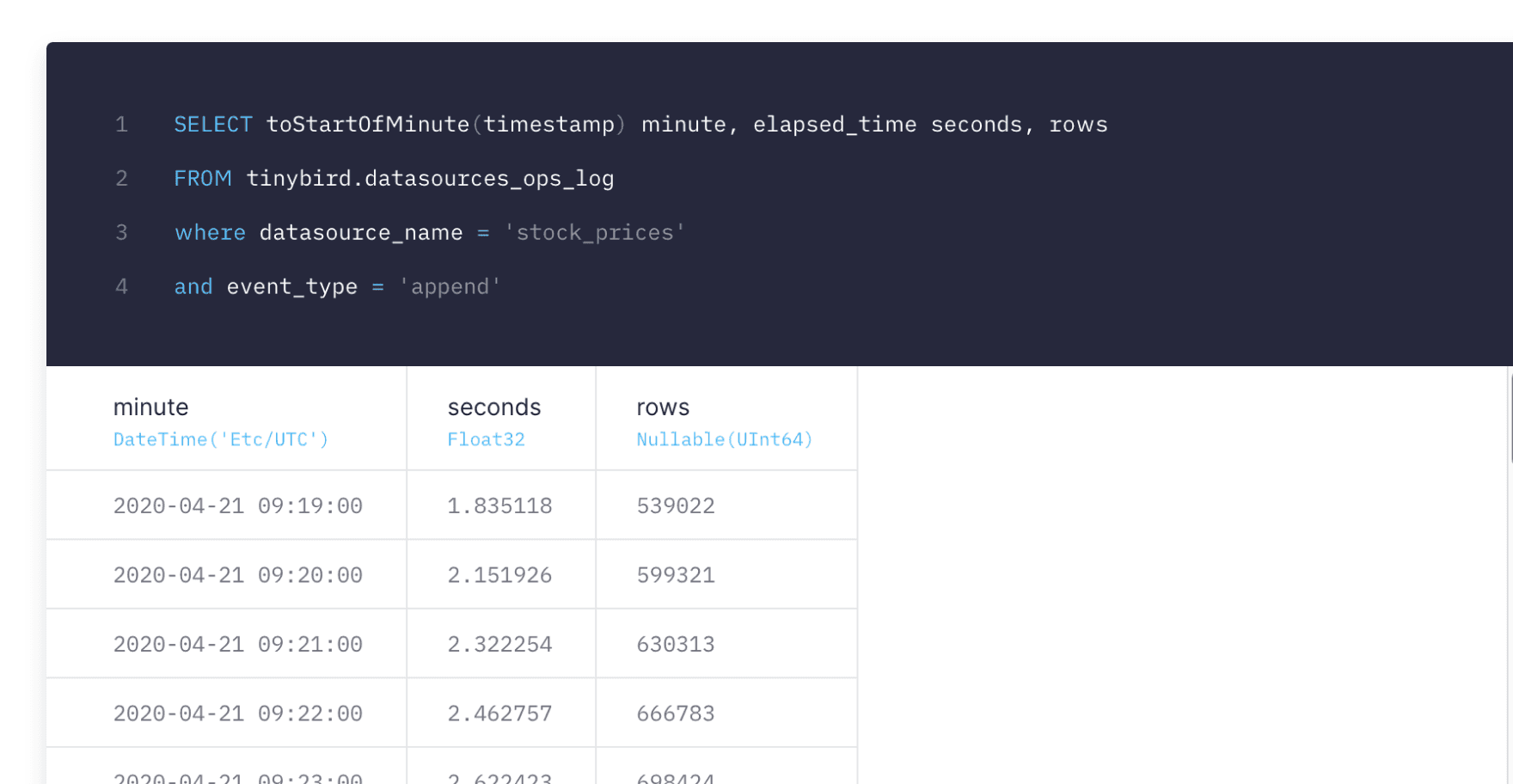 Last but not least, we use a nice trick to generate the data: instead of generating just the ndjson, we generate the SQL that runs on the Tinybird Local database to generate the data. This way, you can change the SQL and the data will be regenerated based on your query. And you can generate as much data as you want (without killing your cloud bill on LLM tokens).
