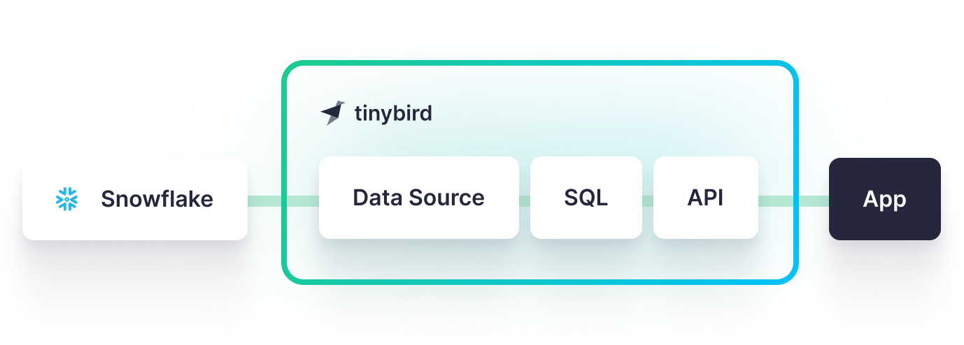 Tinybird acts as a middle layer between Snowflake and your applications that supports high-concurrency requests with very low latency and at a much more reasonable cost. Tinybird ingests data from Snowflake, enables you to query and shape it using SQL, and then exposes those queries as high-concurrency, low-latency REST APIs that can be consumed from any application.