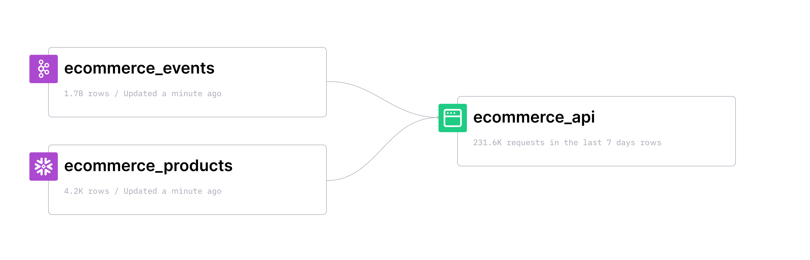From there, you can query and shape your data using SQL and publish your queries as fast REST APIs. With Tinybird, your entire organization can build solutions based on your Snowflake data, without any red tape, with high performance, and in minutes instead of months or years.