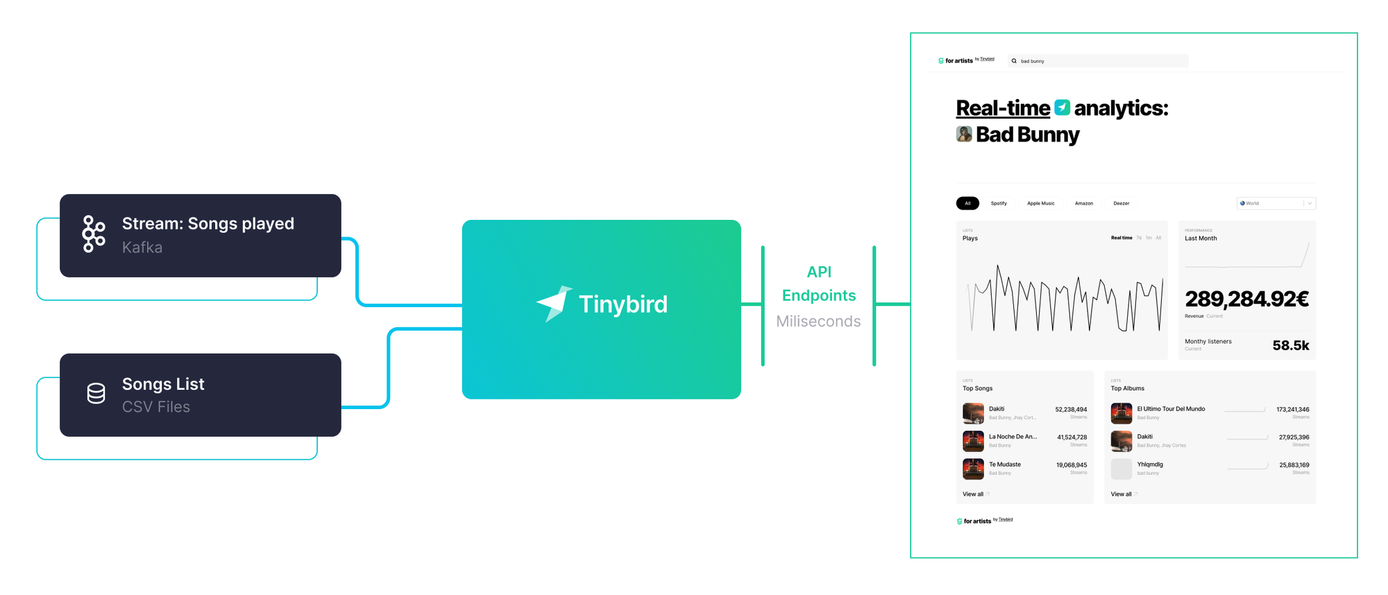 Tinybird’s Kafka connector enables ingestion of streaming data in real-time into Tinybird Data Sources. Through SQL pipes that calculate different stats, data gets materialized incrementally and enriched with song information into other data sources. Those are then used to expose the API endpoints.