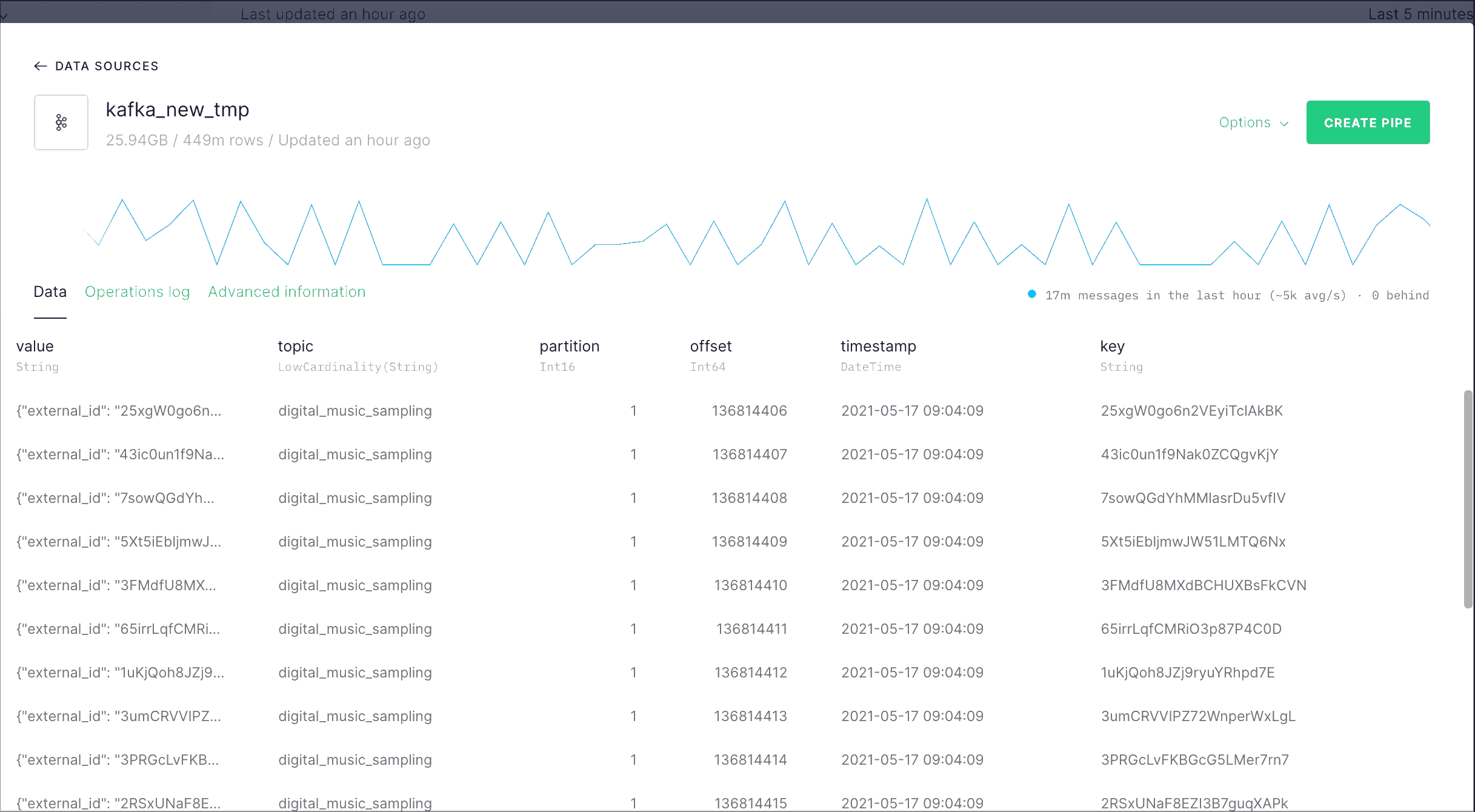 The ingested messages arrive as JSON objects with info about the song ID, time, country and streaming service for every song played. We extract each of those fields with the songplays_mv transformation pipe, which materializes the results to the songplays_kafka_destination Data Source.