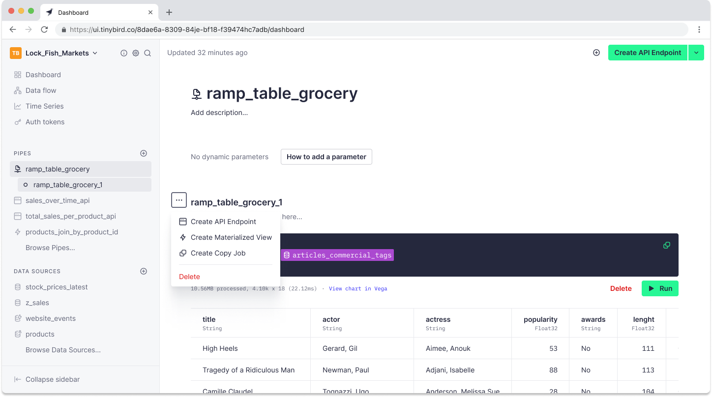 It’s a well-worn and well-loved path: Publishing a high-concurrency, low-latency data API in Tinybird. The API is a powerful and standardized way to share transformations created in Tinybird Pipes as a fully-fledged and documented data product. You write the SQL, publish the query as a dynamic API, and share it with other engineering stakeholders who are able to build data-intensive applications without requiring expensive and slow direct connections to data sources or needing to support an API development framework on top of those data sources.