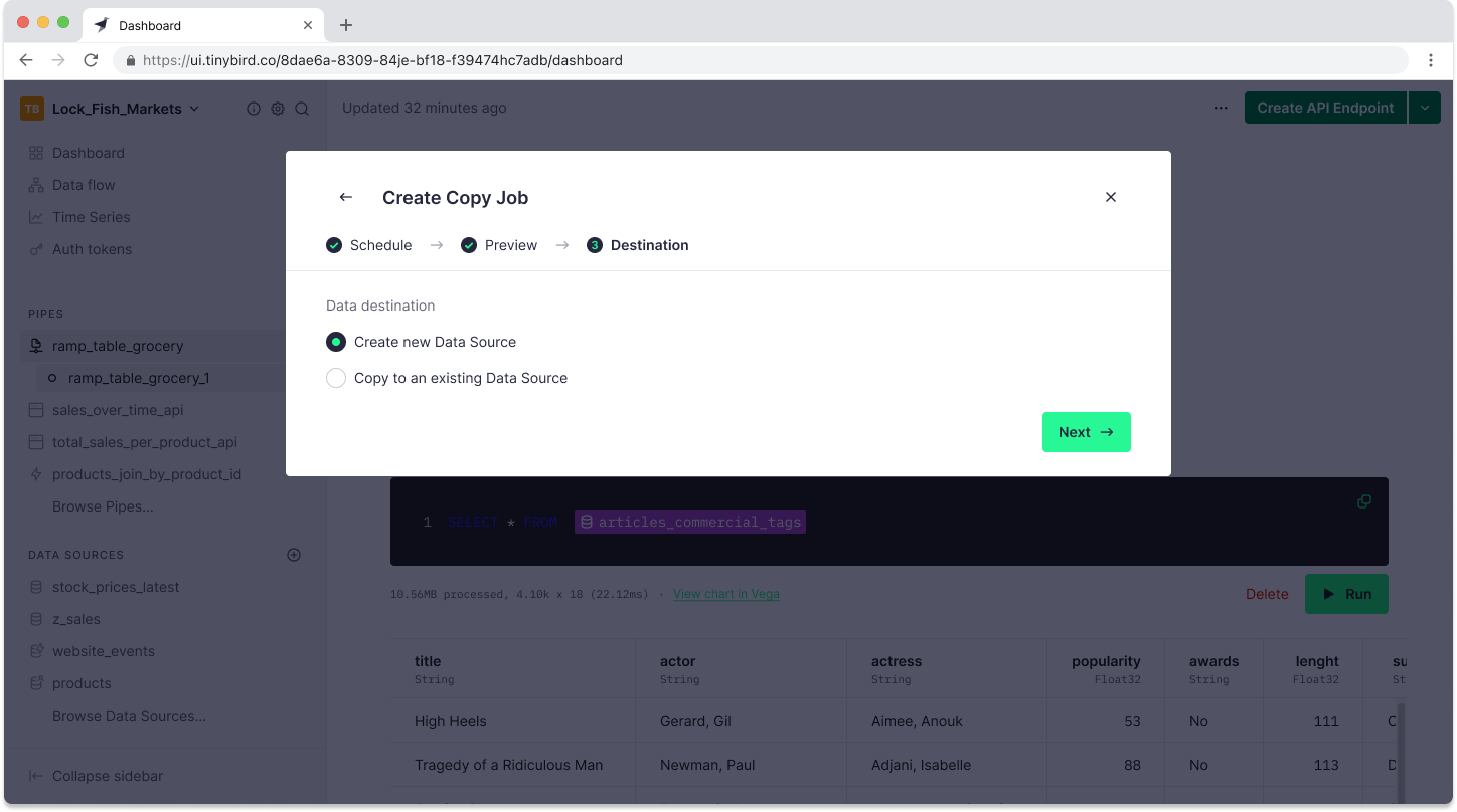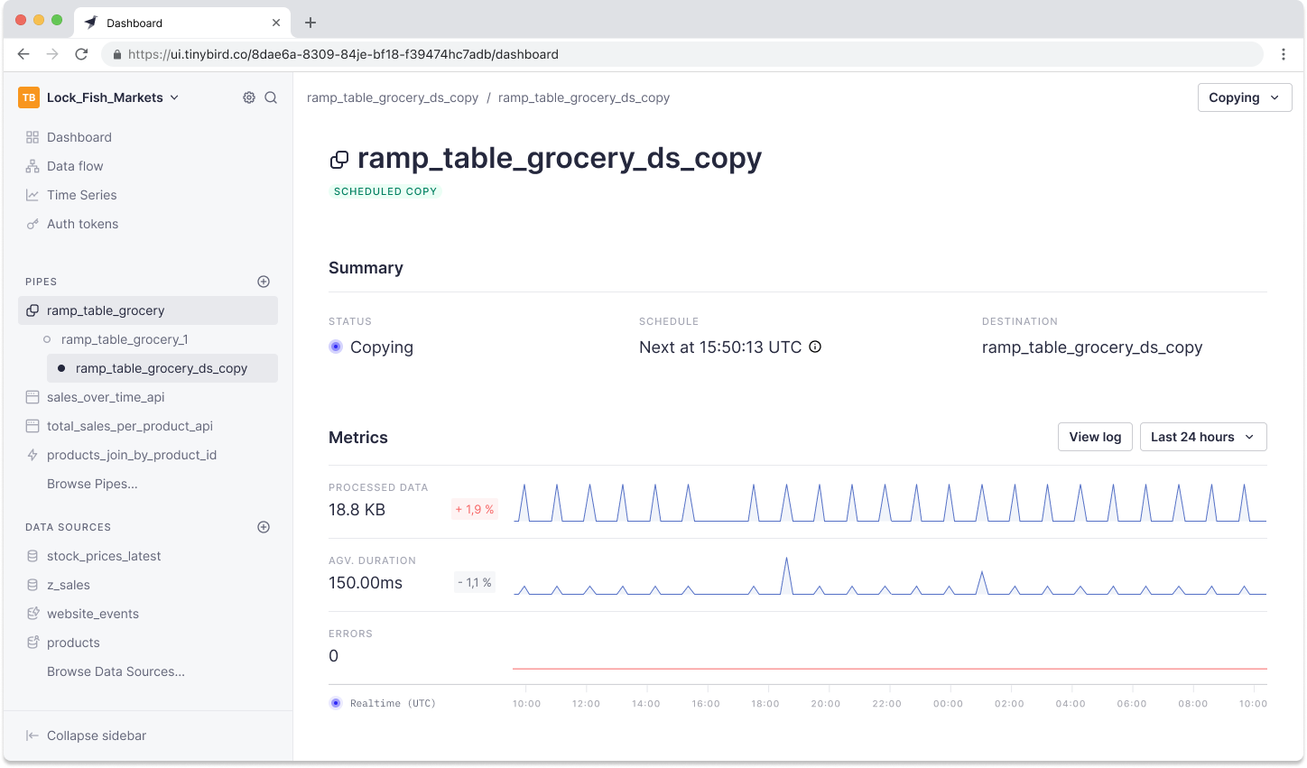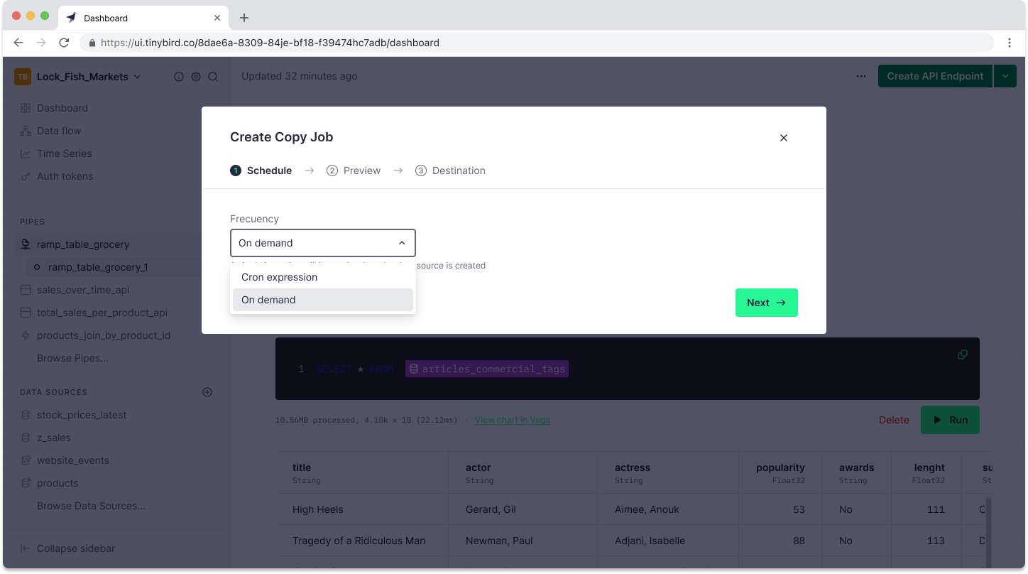 This is what Copy Pipes allow you to do in Tinybird. A few months ago, we released the Copy Pipes API, a new API that enables you to sink the results of a Tinybird Pipe into a new Data Source. We released this API in beta based on feedback and needs from a few power users, but since its release, it has been more widely adopted than we initially expected.
