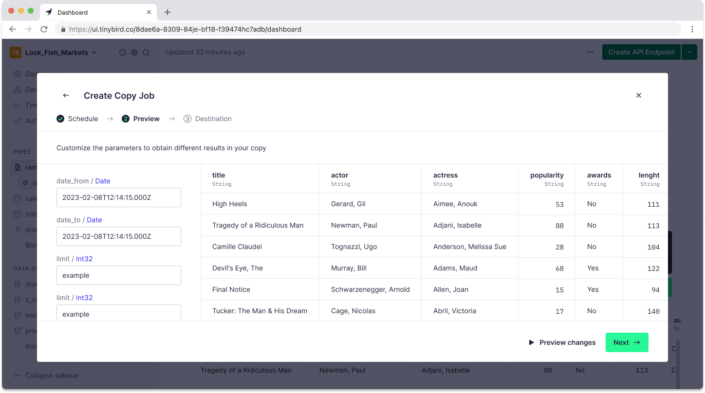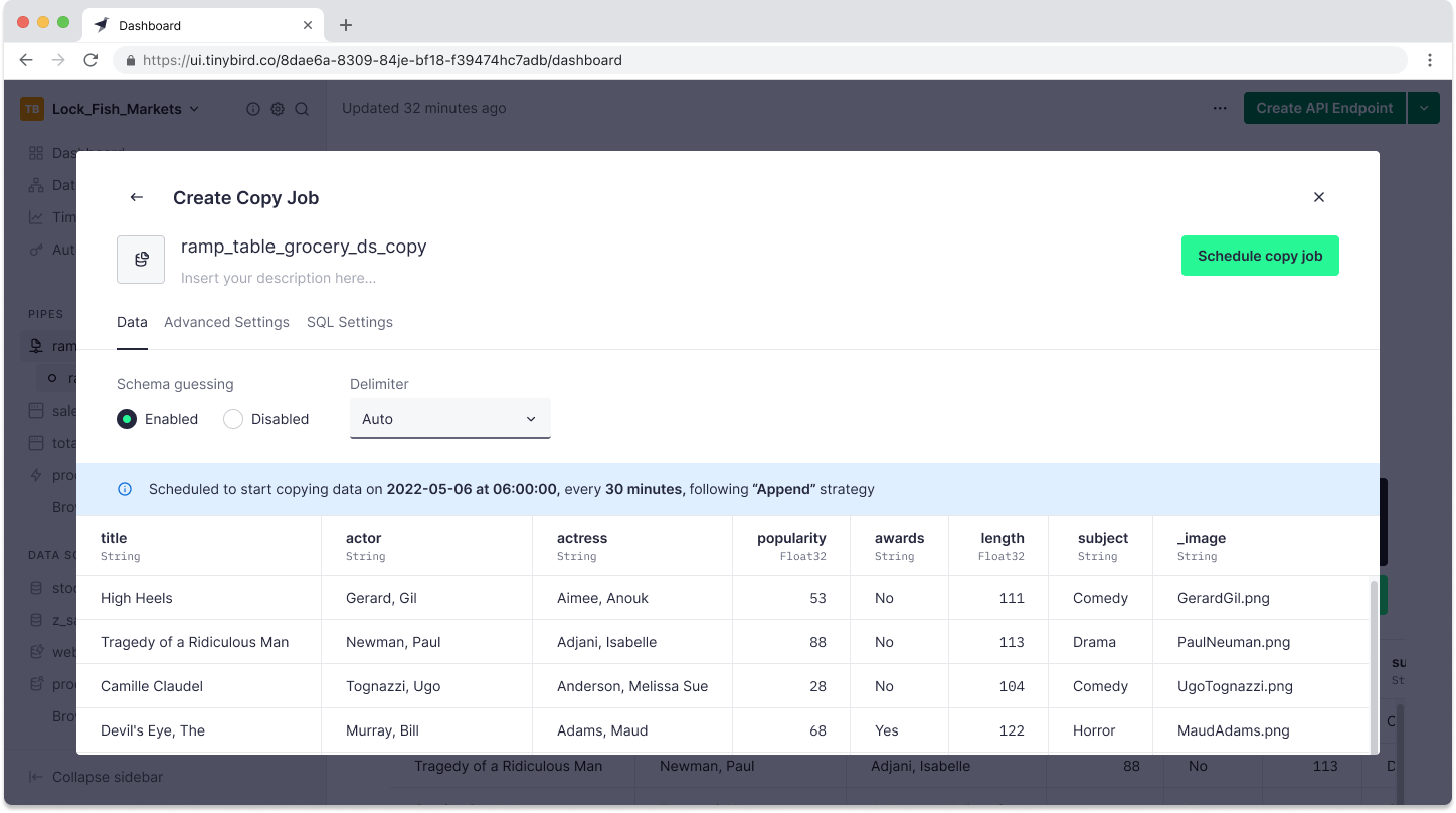 If you select “Create a new Data Source”, you’ll go through the familiar steps of creating a new Tinybird Data Source. Tinybird will guess the schema, which you can edit before submitting the copy job.
