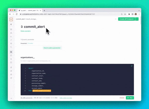 - Filter only Organizations above an alert threshold. You’ll notice I used the Tinybird templating language in the
