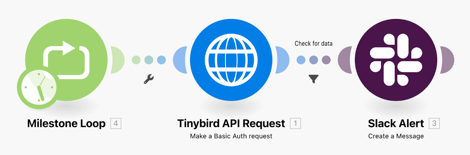 The last step was to create an automated workflow to hit the Tinybird API Endpoint and send an alert to Slack when a customer reached a milestone.