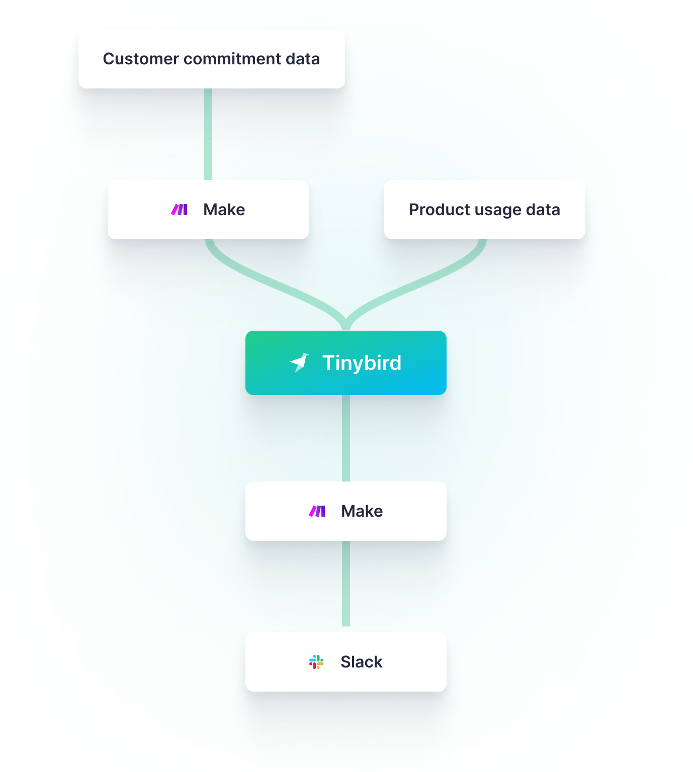 I used Tinybird to ingest customer usage and commitment data from multiple sources then query it with SQL and publish those queries as APIs. I used Make to call those APIs on a schedule and notify our sales team through Slack if customers exceed usage thresholds.