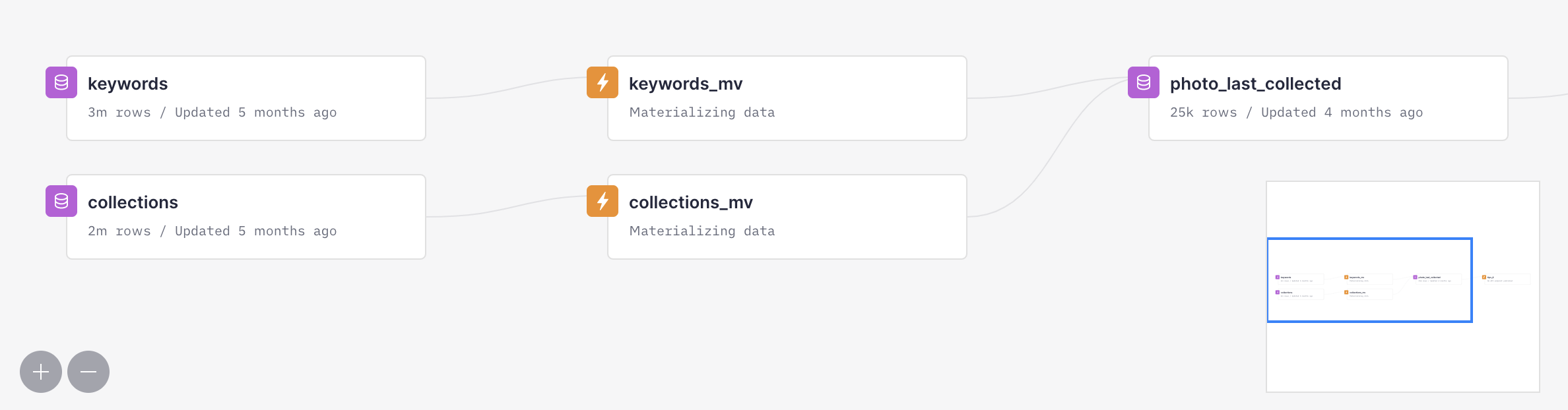 And the following view materializes the photo id, the last time it was added to a collection, the collection id and the collection title that belong to each photo to the photo_last_collected Data Source: