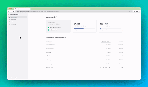Tinybird Enterprise plans include generously-discounted data plans that cover all the billable Workspaces created on the platform. The administrators of these plans want to know how much of the plan their teams are consuming, and they’d like to understand who or what is driving any spending outliers so that they can proactively address the situation.