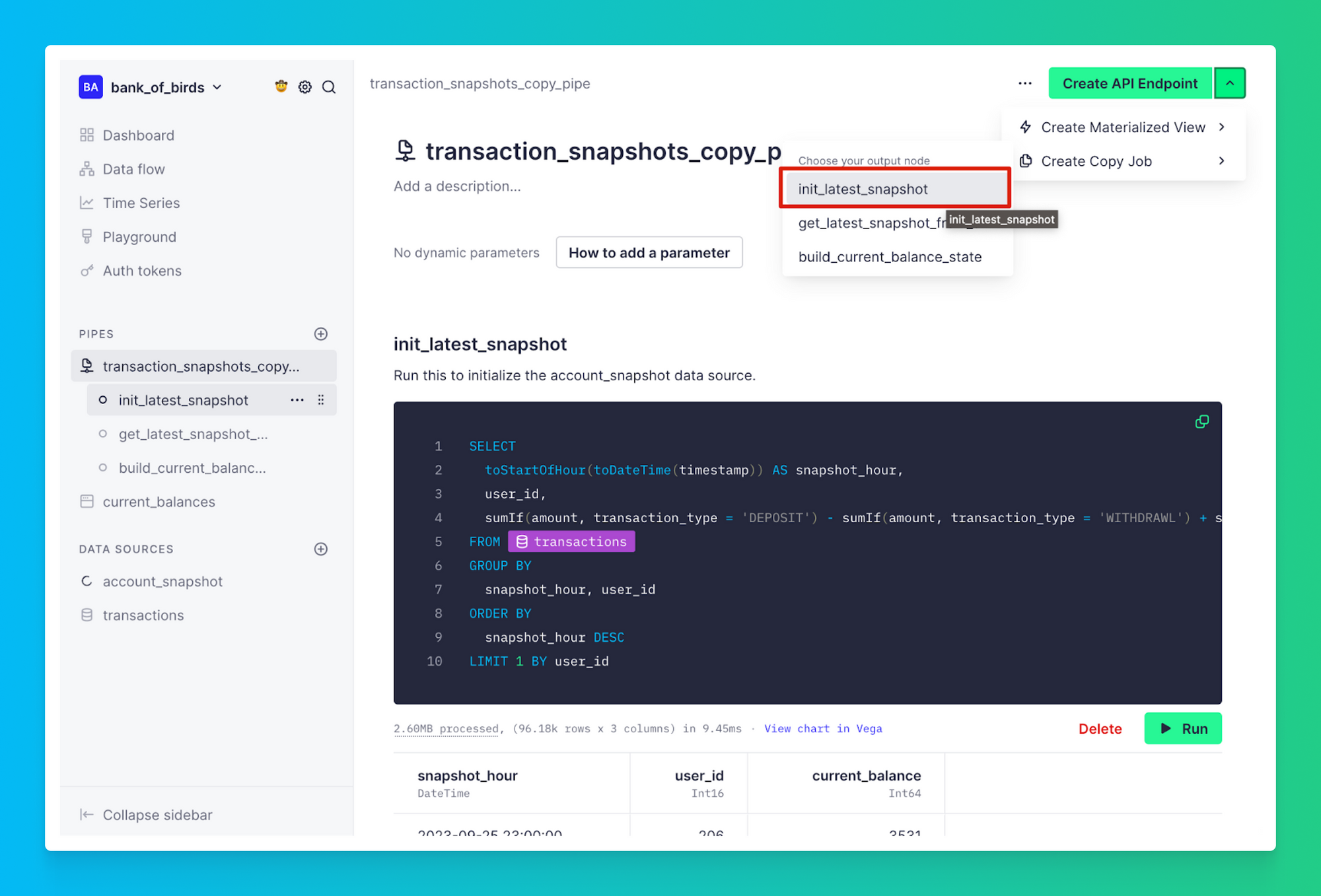 After you run the node, you can confirm that your final user balance is equal to the sum of all their balances with a quick check. You can then create a new Copy Pipe from this node. Click the caret by the “Create API Endpoint” button, select the “Create Copy Job”, and choose build_current_balance_state to generate the new snapshot.