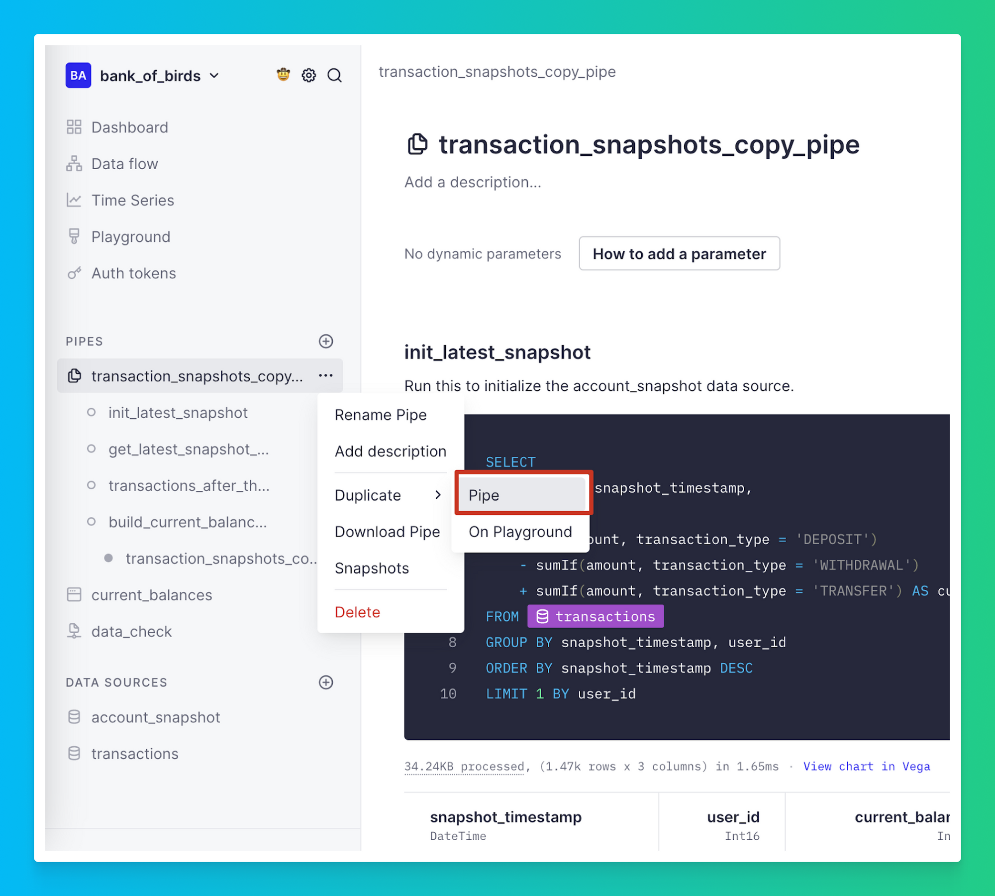 1. Duplicate your Copy Pipe: The logic you implemented in your Copy Pipe for building up the current balance of your users' accounts is sound, but in order to isolate services, you will need to duplicate it into a new Pipe. You can do this by clicking the ellipsis next to your Copy Pipe, selecting “Duplicate” and “Pipe".