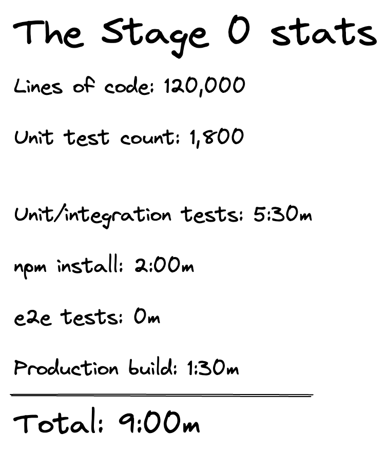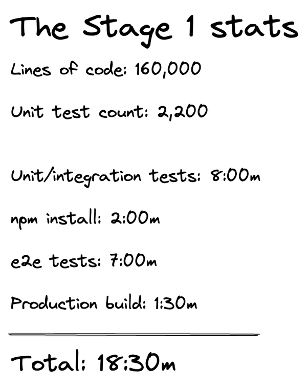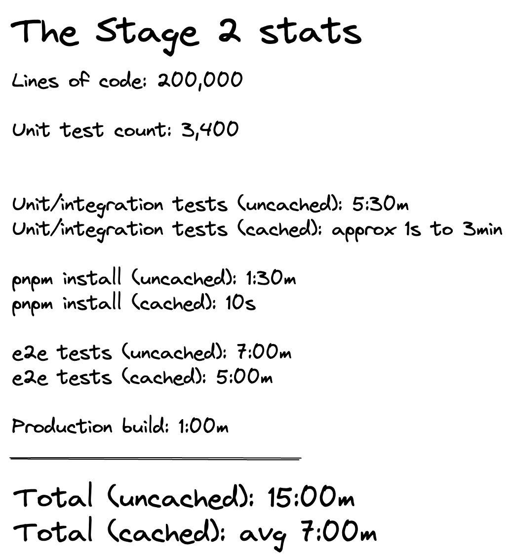 Even with all these new additions, the uncached CI time clocked in at just 15 minutes, a 25% improvement over the prior stage despite a big increase in test coverage and LOC.
