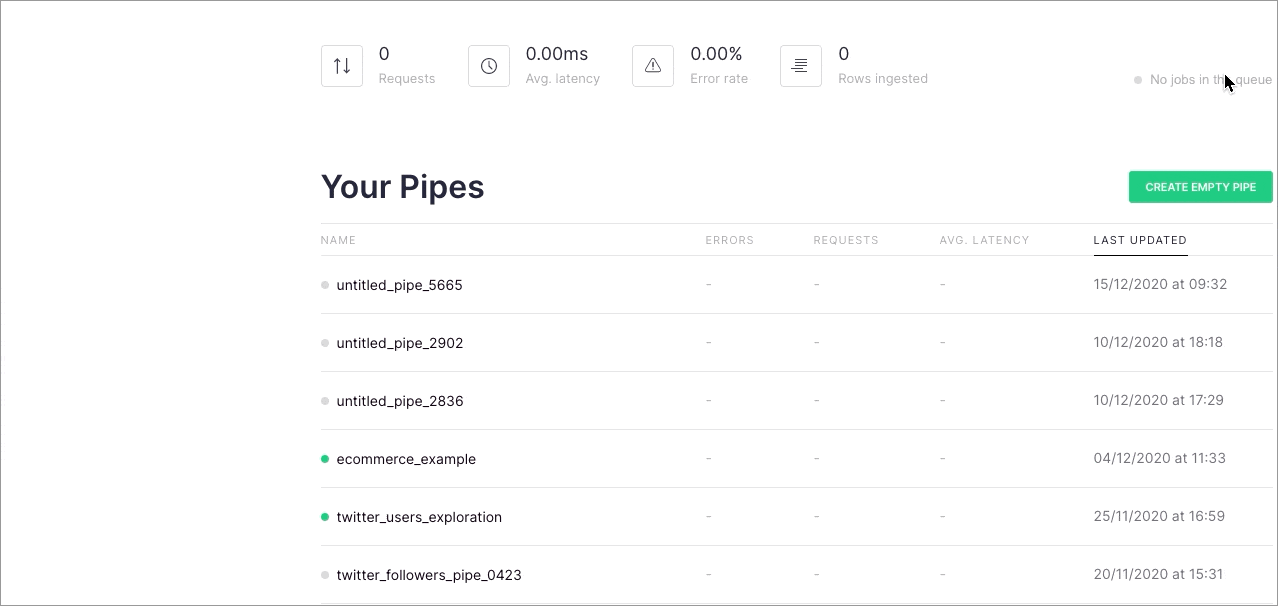 Ingesting data from an URL, populating a materialized view or specific background queries are things that normally can happen asynchronously and that sometimes take a few seconds to finish. This kind of asynchronous operations in Tinybird are called jobs.