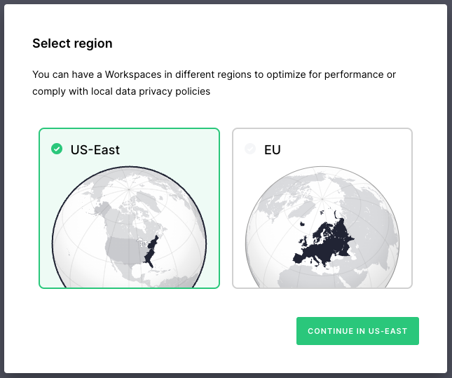 You can set up Tinybird workspaces in different regions to optimize for performance and comply with local data privacy laws. You’ll be prompted to select a region when you log in. Choose the region you need for your application.