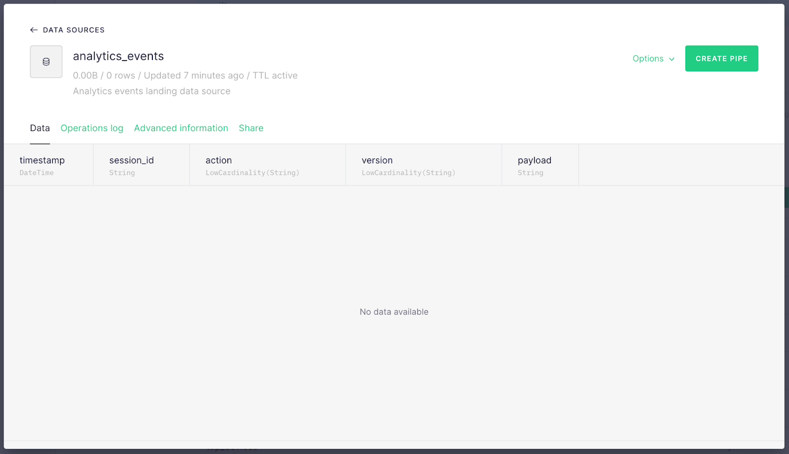 In the Workspace you just created, you’ll see an analytics_events Data Source. This is where the JavaScript tracker we install in the next step will send events data like pageviews from your website. If you click on that Data Source, you can see that it currently has no data in it.