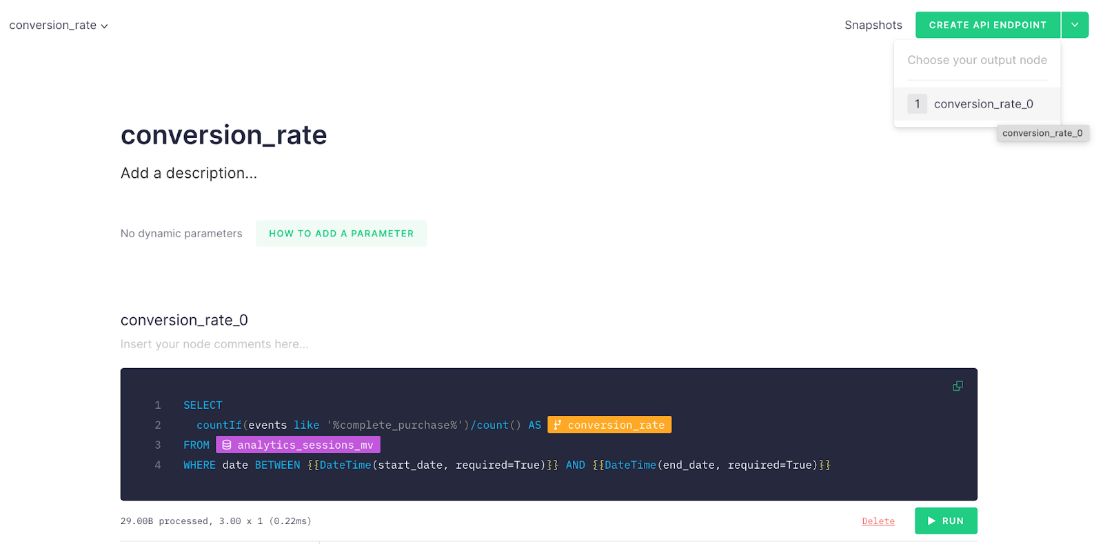 Here’s an example of a simple Tinybird Pipe that might select a count of sessions that contain a complete_purchase event (from the above example) divided by the total number of sessions to get a conversion rate (assuming you added to your analytics_sessions_mv Data Source a column called events containing a JSON payload (string) of all events during the session).