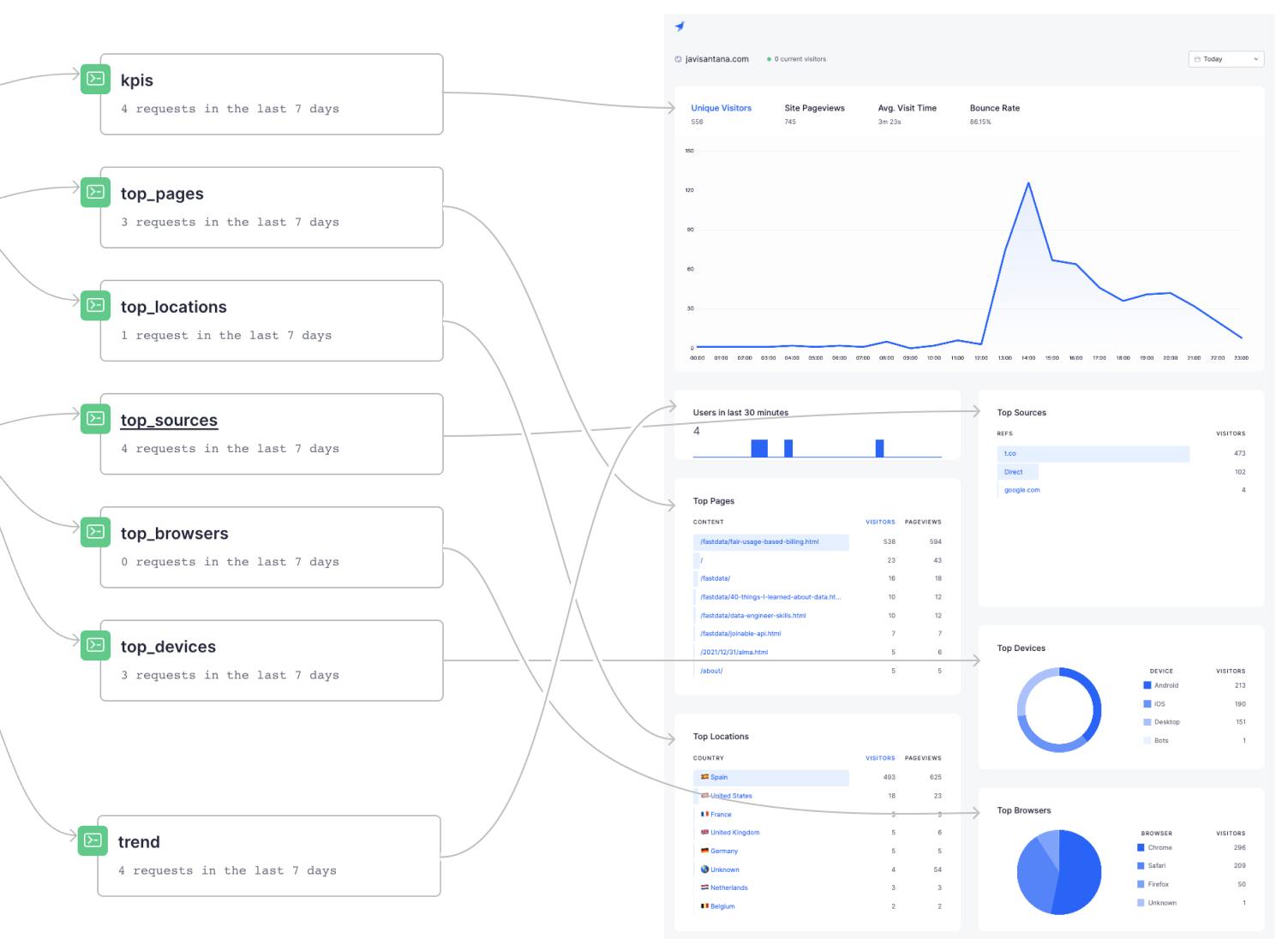 Four additional Pipes flow from the analytics_hits API Endpoint. One of these Pipes, trend, is published as an API Endpoint that feeds the “Users in last 30 minutes” widget in the analytics dashboard.