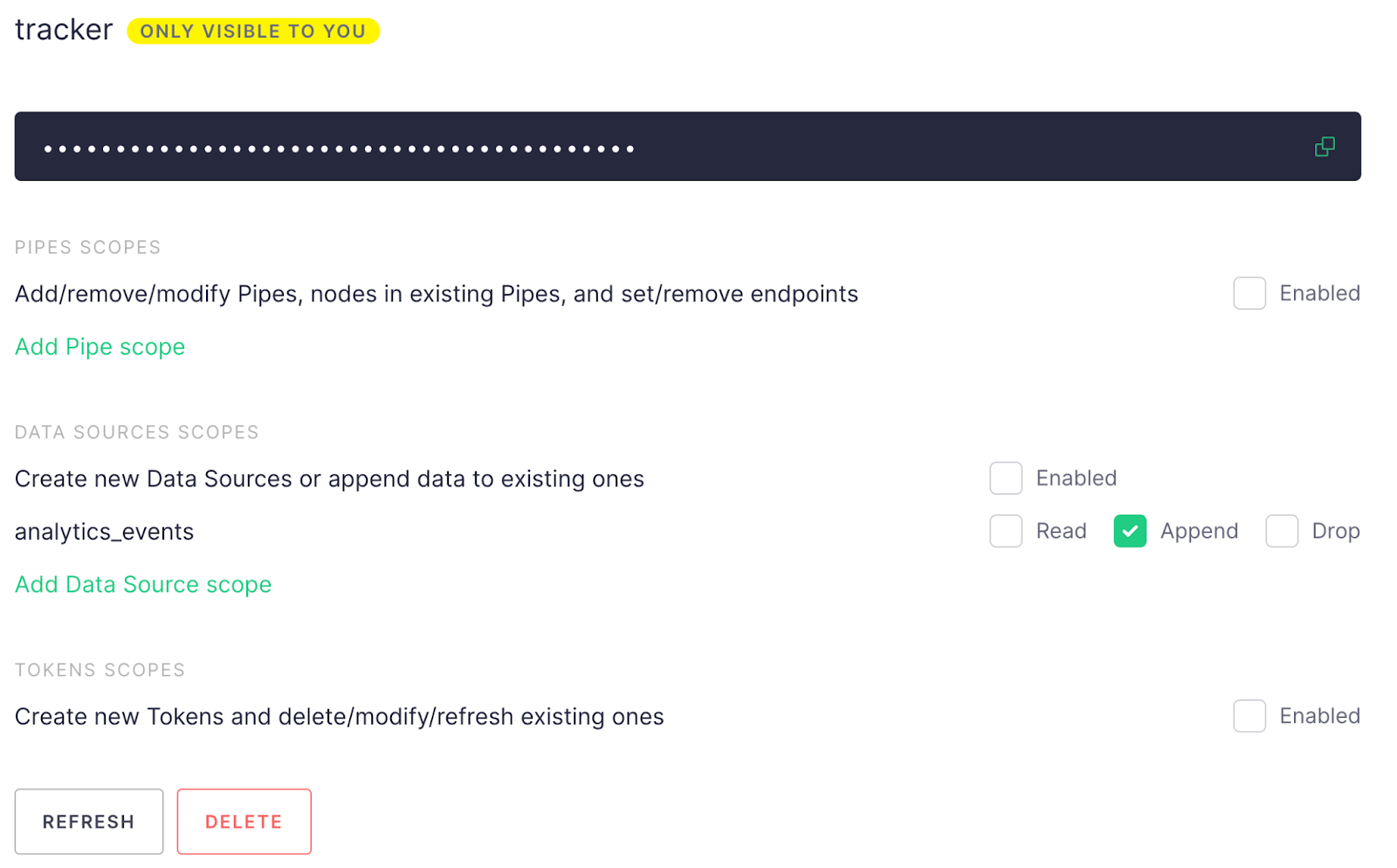 You’ll notice the tracking script includes a data-token attribute. Tinybird uses auth tokens to define permission scopes for interacting with Data Sources, Pipes, and Endpoints.
