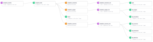 The other three (analytics_sessions, analytics_pages, and analytics_sources) materialize data into Materialized View Data Sources, which store incrementally updated aggregations and can be used to improve endpoint performance by shifting aggregation compute to ingestion time instead of query time.