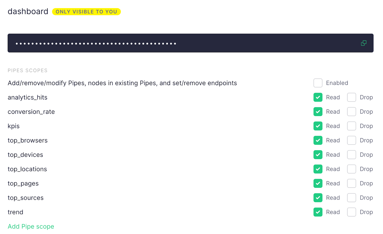 As a final step, make sure to add to the dashboard token a new Pipe scope to give read permission to the new Endpoints you’ve created.