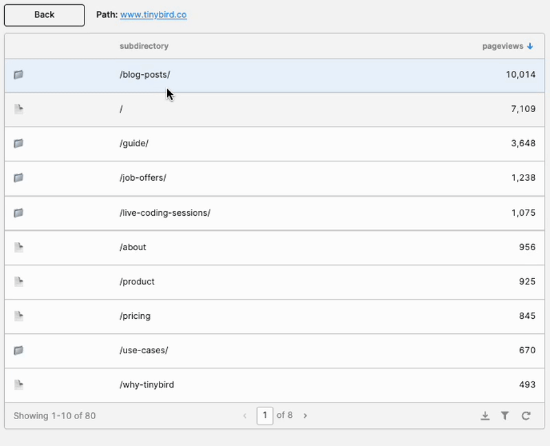 In the case of the Content Drilldown, I wanted the final node of my Pipe to return a list of subdirectories on the Tinybird website ranked by total pageviews within that subdirectory over the specified time period. In addition, I wanted to see a chart of those pageviews over time.