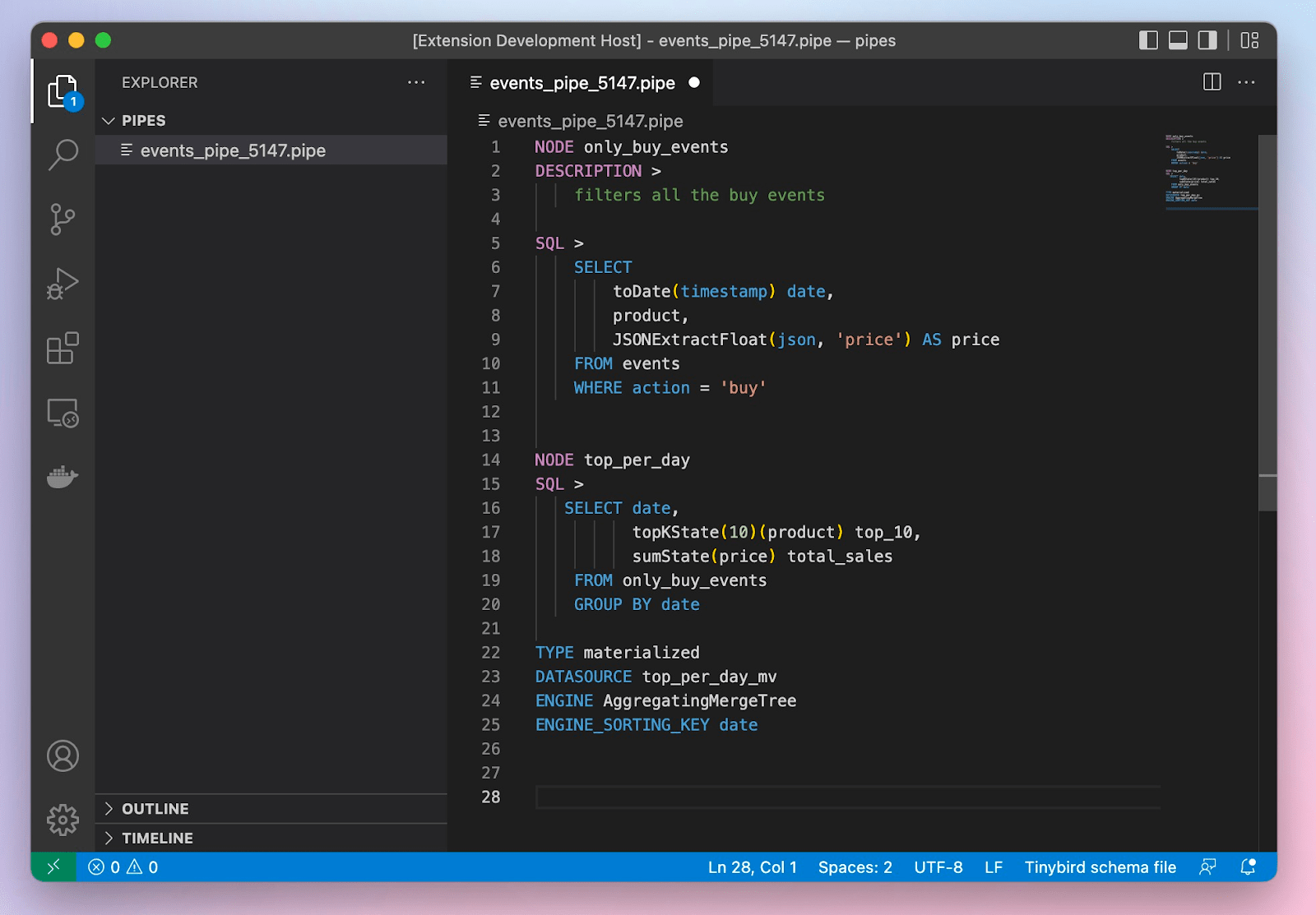 I use VSCode myself, and as I was building Tinybird data projects the other day, I missed having the syntax highlights I’m used to seeing with other languages. Tinybird data projects are meant to be managed like code, with versioning, CI/CD, tests, etc. Why shouldn’t they have their own syntax highlighter?