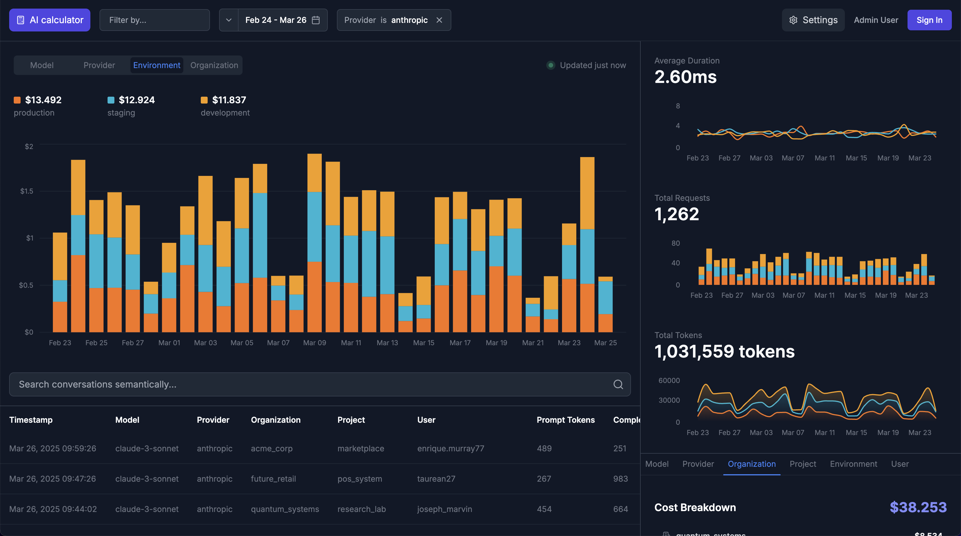 We instrument the LLM calls with custom metadata (project, environment, organization, user_id) saved in the proxy_metadata column. This information is used to join LLM calls with other product events, like API calls, errors, billing, etc. We could also use it for user-facing analytics.