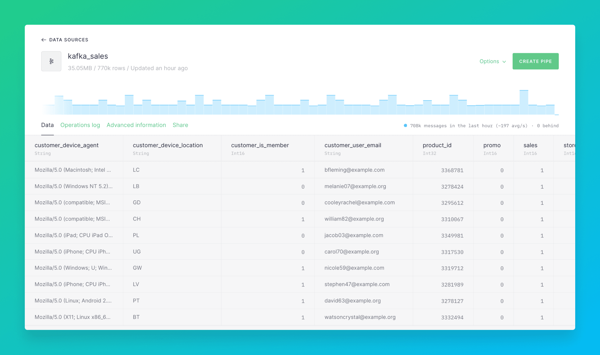 Let’s see in detail how to go from a Kafka stream to a data product running from an API endpoint. This example uses synthetic sales data from an ecommerce site.