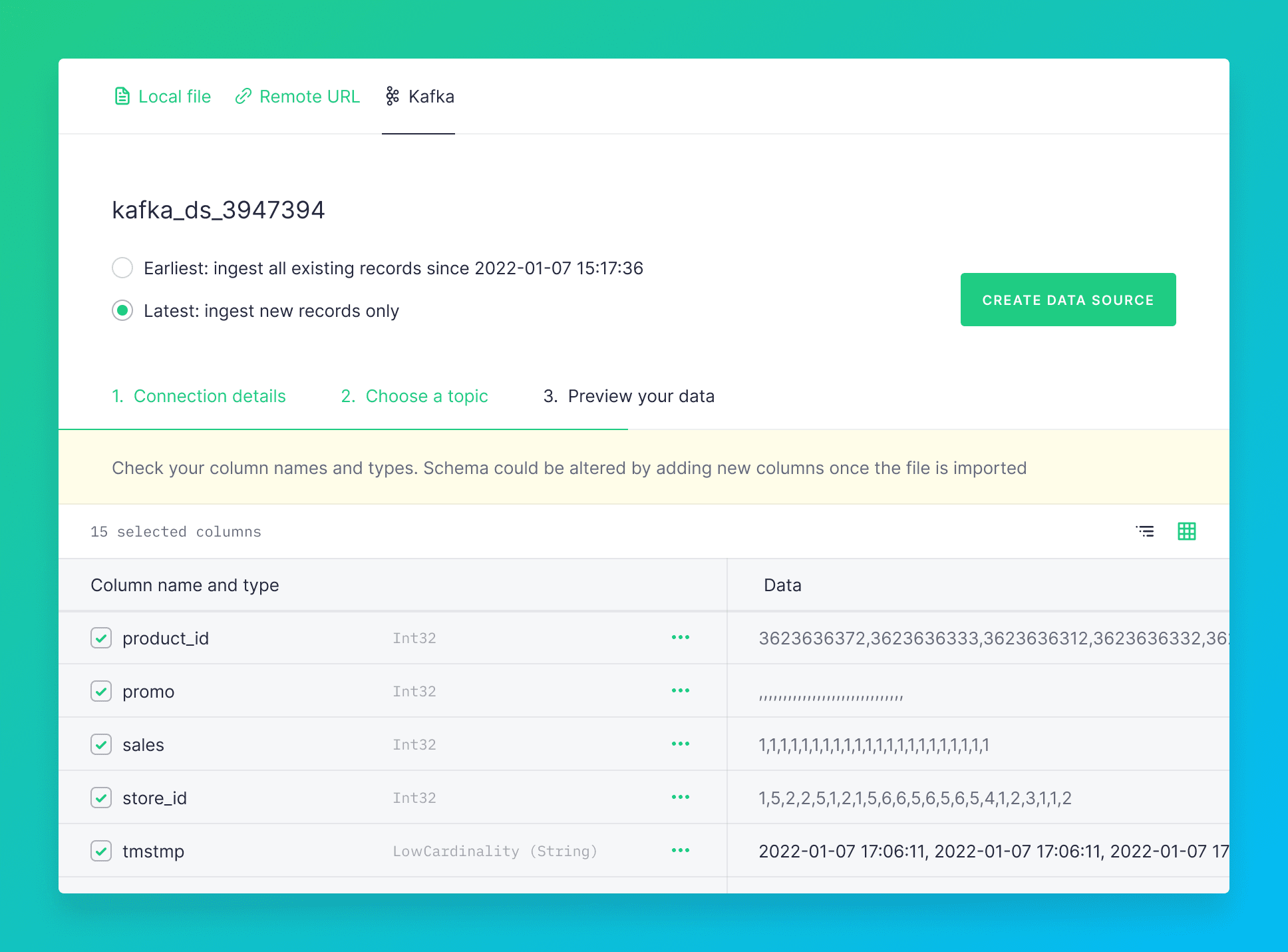 Let’s materialize just some of that ingested data into the z_sales Data Source, which will update in real time as new data comes in from the Kafka stream.