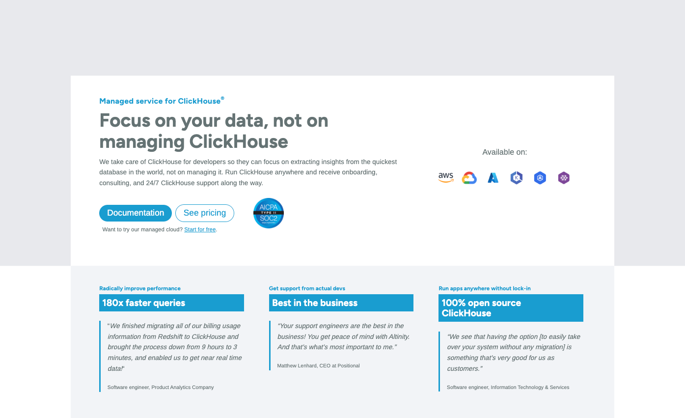 Altinity.Cloud is great for those who want to learn and own a ClickHouse® database - either on managed infrastructure or in VPC - with support from some of the best ClickHouse® practitioners in the world. It's not for fast-moving developers who want a ClickHouse® abstraction; it's built for enterprise-level engineers who know - or want to commit to learning with support - how to manage this database at scale.