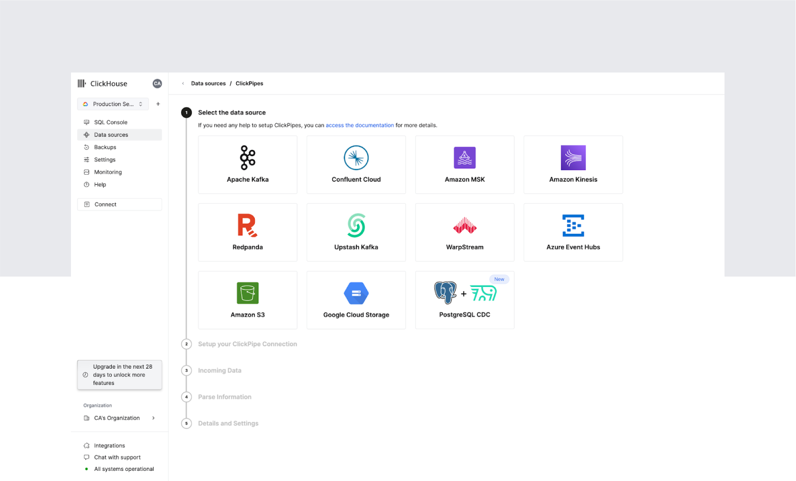 ClickHouse® Cloud also boasts a solid amount of integrations, both managed and supported through community development. The recent introduction of ClickPipes allows for streaming data ingestion from popular sources like Apache Kafka, Confluent, Postgres + Debezium CDC, and others without setting up additional infrastructure.
