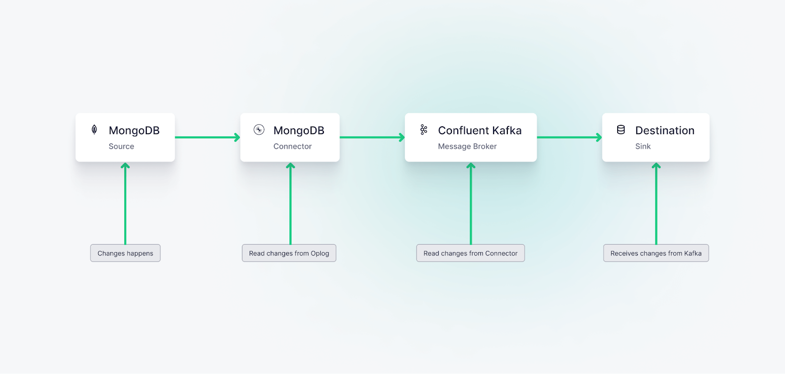 Change Data Capture (CDC) is a powerful pattern that captures data changes and propagate them in real-time or near real-time between various systems. Using MongoDB as the source, changes are captured through its operations log (oplog) and propagated to systems like Confluent Kafka and Tinybird using a connector.