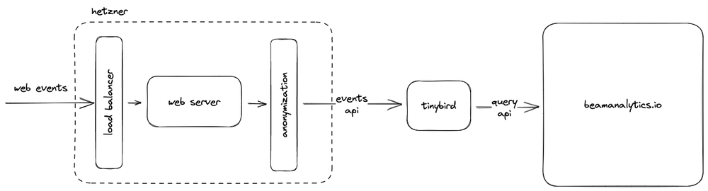 We use the Tinybird Events API to send anonymized, one-way hashed analytics from our cloud to Tinybird. So we can send each pageview to Tinybird with just an HTTP request.