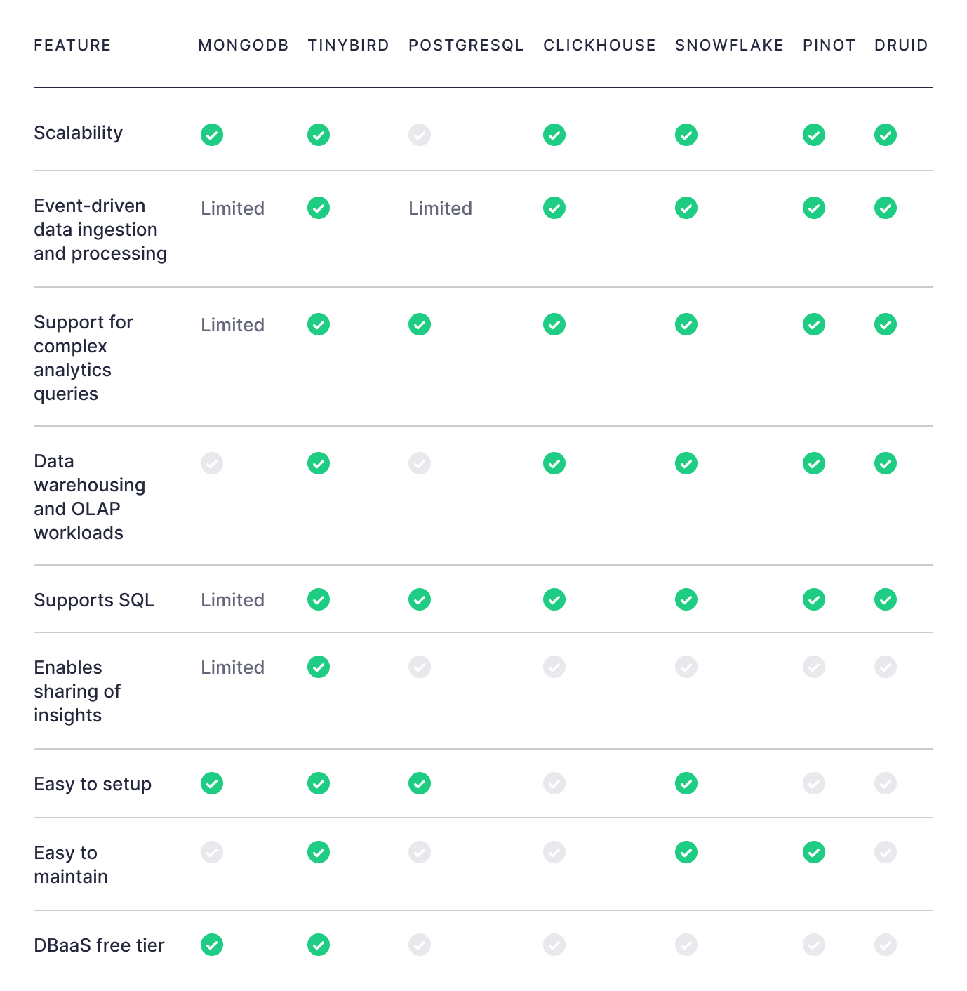 By meeting the outlined criteria for real-time analytics databases, such as data warehousing and OLAP workloads support, scalability, event-driven data ingestion and processing, support for complex analytics queries, and SQL support, Tinybird proves to be a compelling choice for developers. Its ability to simplify setup and maintenance while enabling efficient sharing of insights further underscores its suitability for real-time analytics applications.