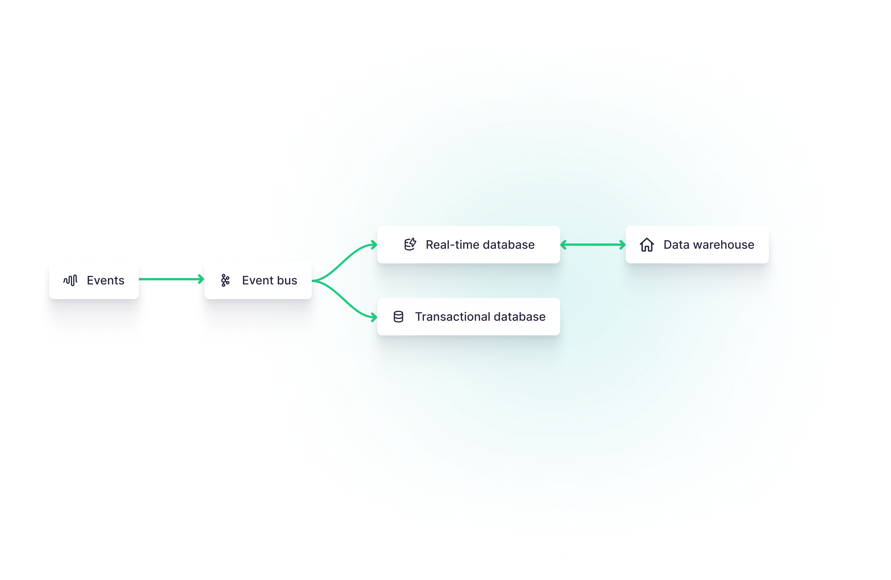 Thus, the base architecture includes the standard event streaming platform/event bus to stream events data into both a transactional database, which may power general functionality for user-facing applications, a real-time database to power real-time analytics, and a long-term data warehouse to store large datasets for business intelligence.