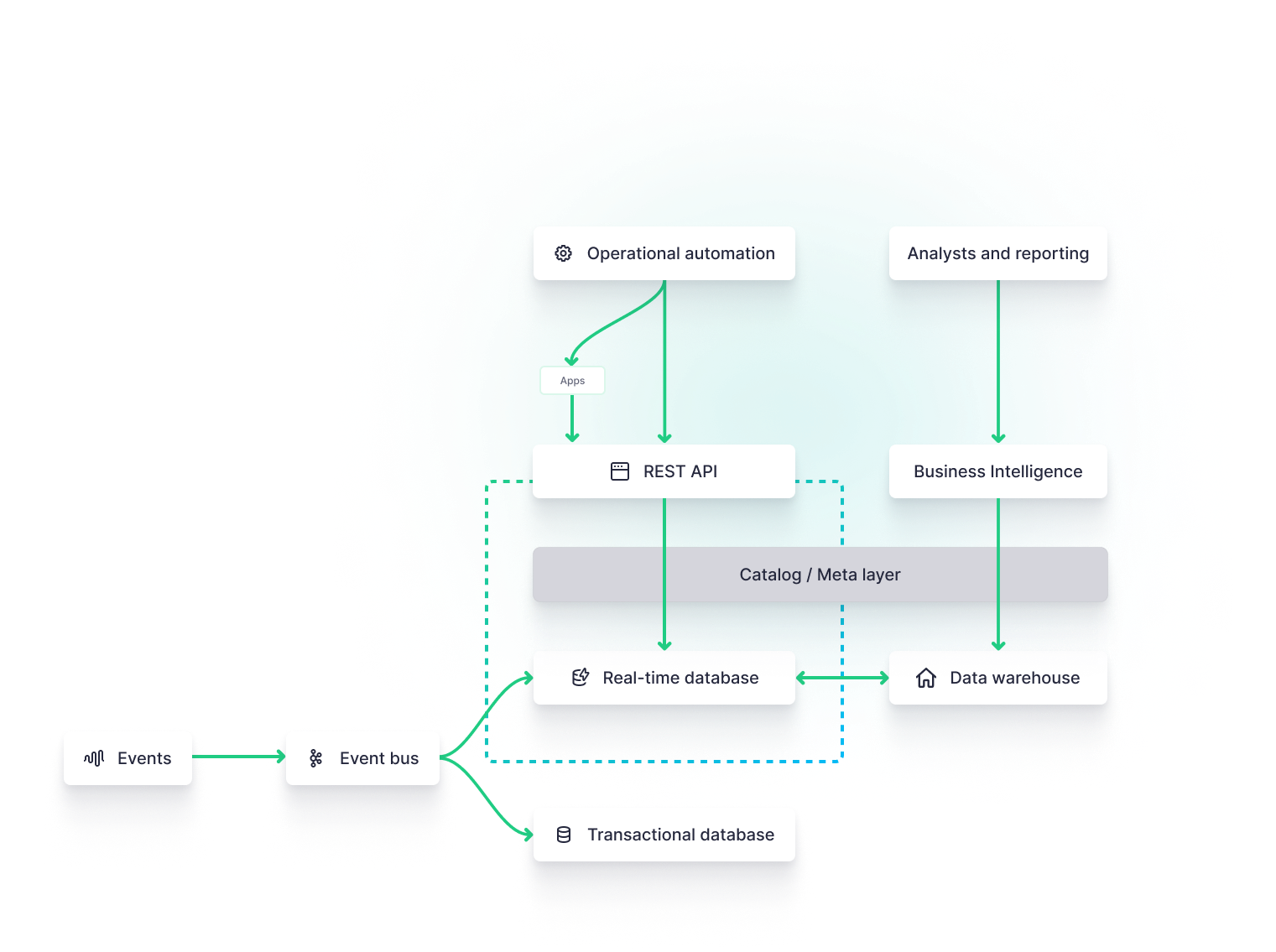 Regardless of approach, real-time data architectures will include streaming events, an event bus, a real-time database, and some sort of API layer for external and downstream consumers to interact with the database.