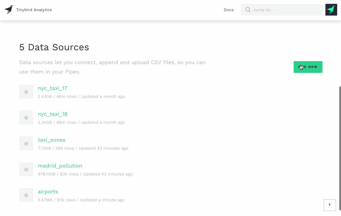 Whenever you build a data pipe in Tinybird Analytics, your transformation nodes will always remain connected to the Data Sources they use. As soon as those Data Sources change, all their related transformation nodes will be recalculated in real-time. No delays.