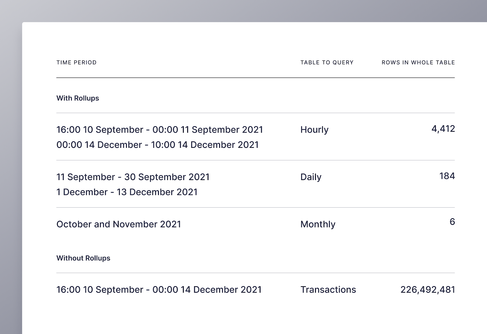 The chart example gives a nice visual of how we can use rollups to improve dashboard performance, but I want to dig into the underlying performance by showing how a query that dynamically chooses from materialized rollups performs massively better than one which scans the whole table.