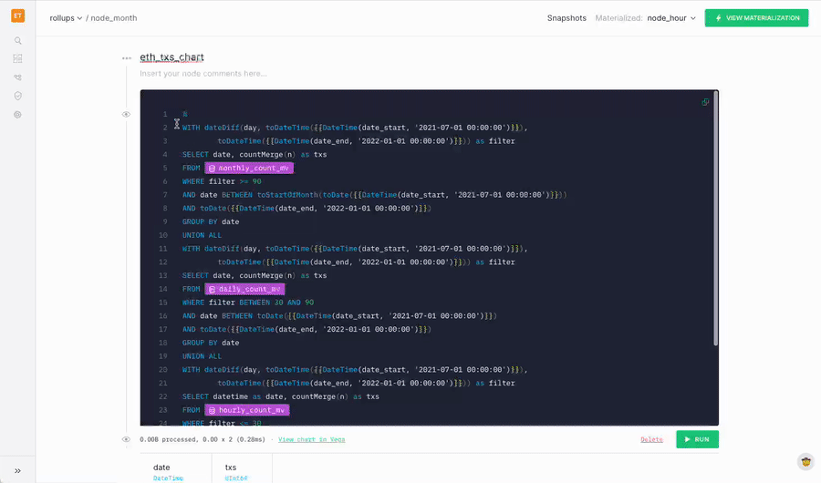 You can see that I’m defining filter based on start_date and end_date, and choosing which Data Source to used based on the timespan. In each section, I use counteMerge(n) to aggregate all the results (the -Merge combinator ensures that intermediate results in the Materialized View are included in the count), and a then I GROUP BY date.