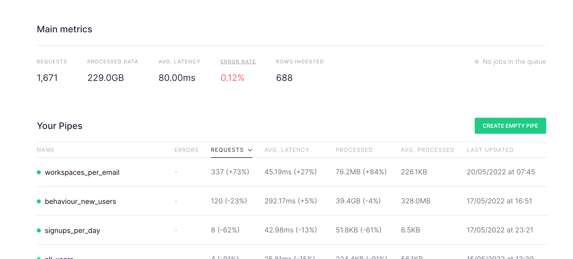 Finally, since we’ve improved pipe_stats_rt, we figured we’d offer an easy way to explore that performance in the Tinybird UI. If you want to compare all your published Pipes, in the dashboard we have included the average and the total processed data: