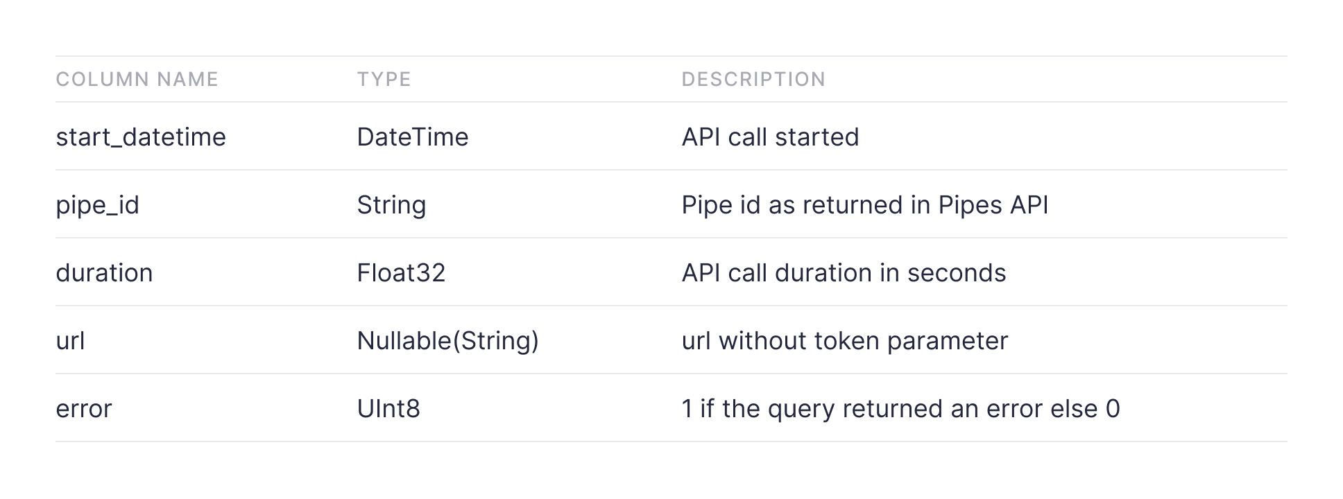Every request to a pipe is logged to tinybird.pipe_stats_rt and kept in this Data Source for the last week. This service Data Source can be used to monitor pipe health. These are the columns: