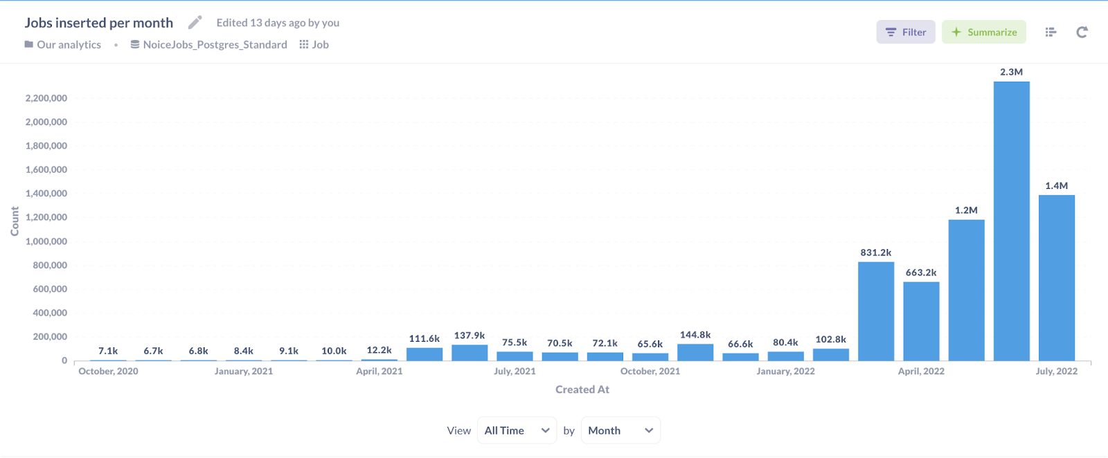 Then, in May 2021 the number of jobs scraped per month grew by 10x, and I had to go back to the drawing board as the previous process got too slow.