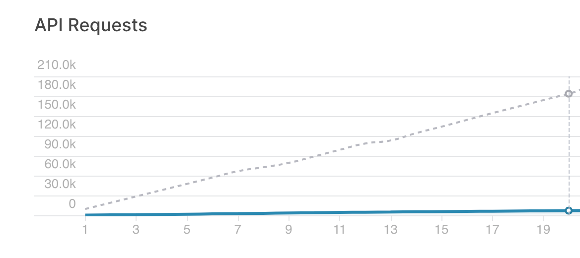 With this approach we were able to collapse 5,000 queries into just one, reducing significantly the amount of data we read and the queries we make, as you can see in this chart (where the blue line is the number of queries made this month and the dotted line is the number of queries made in the previous approach)