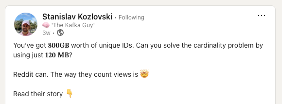 I recently came across an interesting LinkedIn post about how in 2017 Reddit designed the system to count post views and unique viewers:
